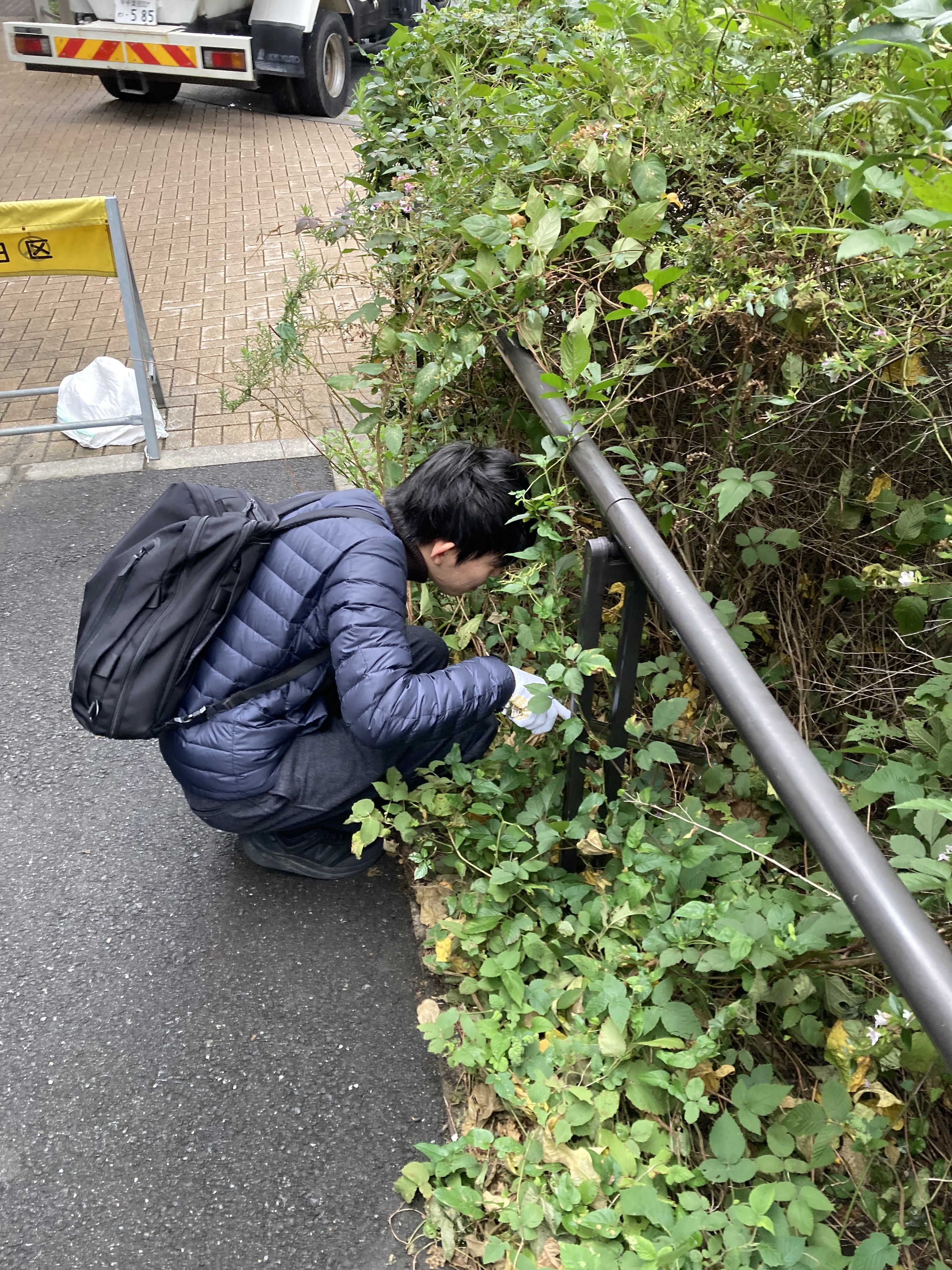 落ち葉やゴミを拾いながら、歩道や植え込みを中心に清掃。